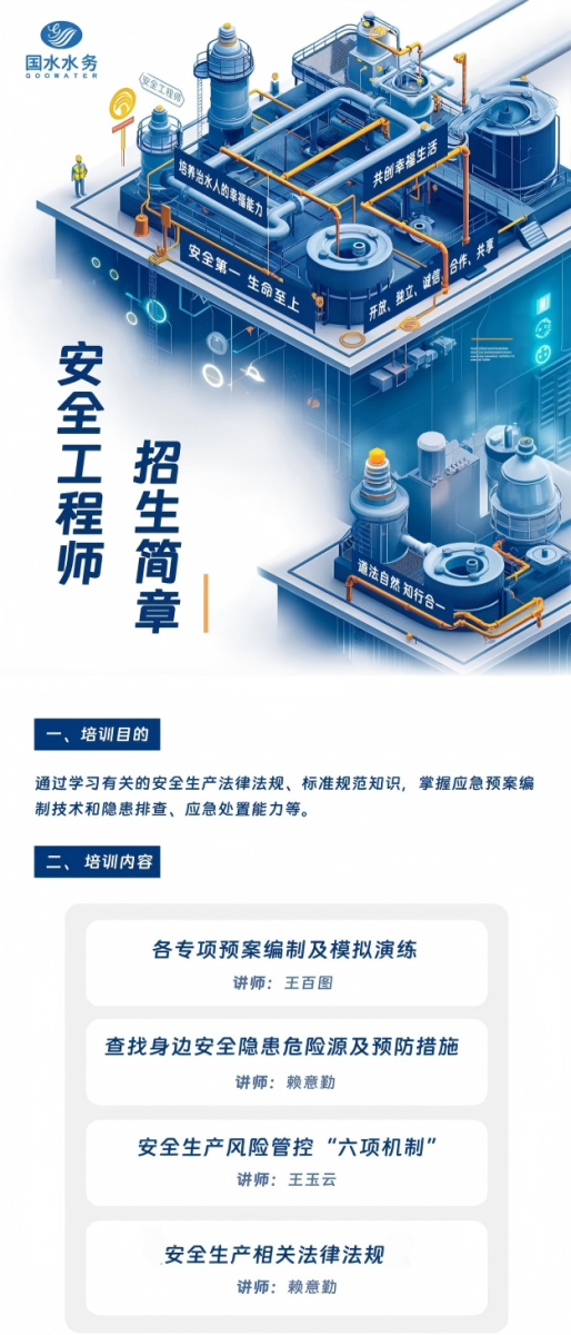 “安全是底線,人才是防線?!?/strong>近日,國水水務“安全工程師崗位培訓+內(nèi)部安全攻堅活動”雙軌行動正式啟動。這不僅是公司深化“學安全、強技能、固防線”內(nèi)部建設(shè)的關(guān)鍵舉措,更標志著國水水務將“自我安全賦能” 的實戰(zhàn)經(jīng)驗,轉(zhuǎn)化為面向涉水企事業(yè)單位的 “安全人才培育+安全體系搭建” 培訓產(chǎn)品正式成型?—— 既實現(xiàn)自身安全人才專業(yè)化、內(nèi)部安全管理標準化,更能為客戶提供 “可復制、可落地” 的安全培訓和安全生產(chǎn)服務,真正做到“先筑牢自家籬笆,再為客戶遮風擋雨”。
